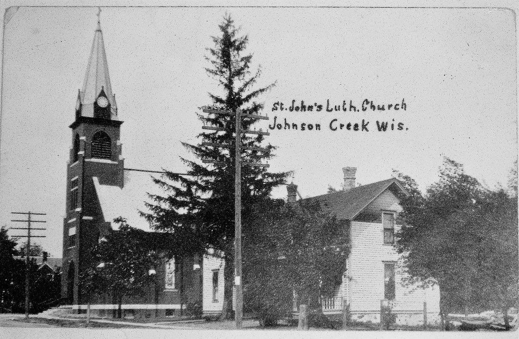 The Evangelical Lutheran Congregation of St. John’s Lutheran Church in Johnson Creek, WI was founded in February of 1885, by several former members of the Evangelical Lutheran Congregation in Farmington and some other Lutherans living in the Johnson Creek area, but without a church affiliation. Pastor Johan Denninger of Farmington wrote a constitution. Messrs. Louis Siegmann, Deitrich Manz and Carl Harnack were elected as elders. The minutes of the first congregational meeting were recorded by Mr. Heinrick Christians. The people, thus united, purchased an old, unused Baptist Church and the lot, on which the present church and parsonage stand, for $700.00. On the lot at the time of purchase were a blacksmith shop and a house. These were torn down and the Baptist Church moved into the foundation of the old shop.